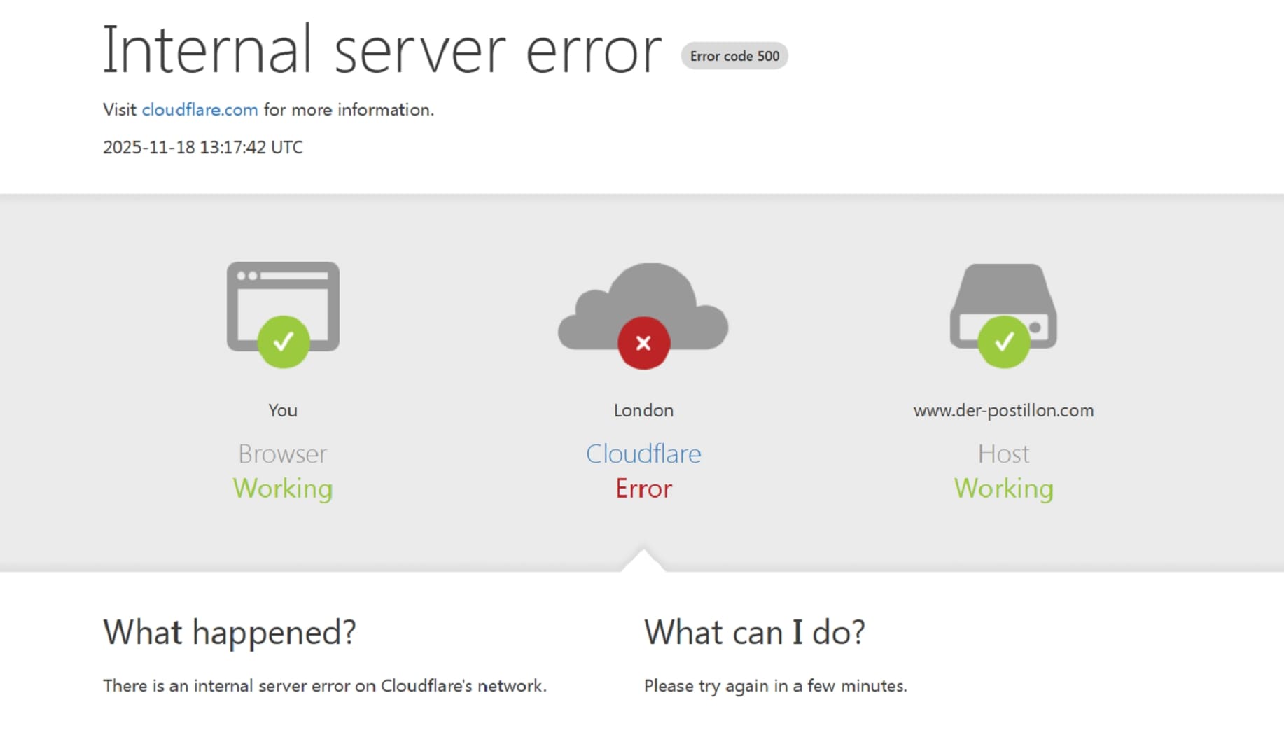 Aufgrund der zentralen Rolle von Cloudflare als Schutz- und Zugangs-Dienstleister sind viele Webseiten derzeit nicht erreichbar und zeigen Fehlermeldungen an. Diese Hinweise deuten direkt auf Cloudflare als Problemursache.