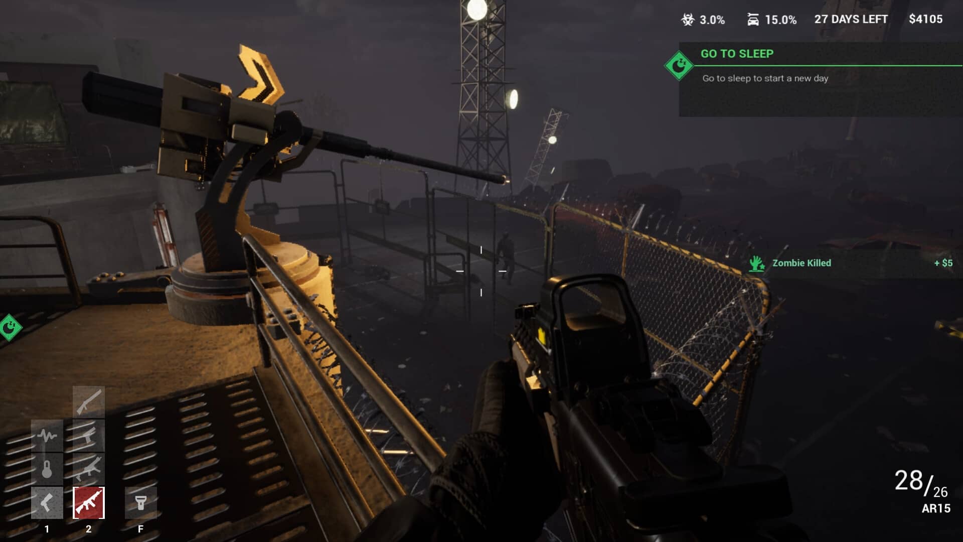 Zusätzlich integrieren die Entwickler klassische Shooter-Elemente in das Spielgeschehen. Wir verteidigen unsere Basis aktiv gegen angreifende Zombiehorden, kaufen neue Waffen, errichten automatische Geschütztürme und greifen selbst aus der Ego-Perspektive ins Geschehen ein. Gerade dieser actionreiche Anteil sorgt für spürbare Abwechslung, da wir nicht ausschließlich verwalten, sondern direkt kämpfen und reagieren müssen. Ergänzt wird das Ganze durch Management-Mechaniken: Wir verdienen Ressourcen, fordern neue Ausrüstung an und reparieren Schritt für Schritt unser Fahrzeug, das später für Expeditionen außerhalb der sicheren Zone benötigt wird. Dadurch entsteht ein Hybrid aus Simulation, Base-Defense und First-Person-Shooter.
